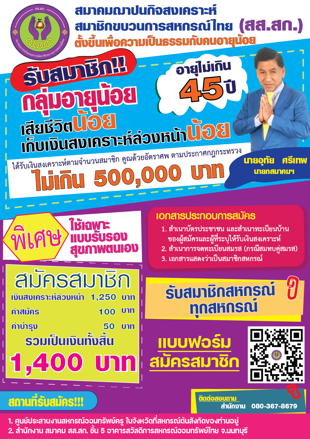 | สส.สก. | สมาชิกสหกรณ์ฯ, คู่สมรส, บุตร, บิดา, มารดา, บุตรบุญธรรม,พี่น้องร่วมบิดา/มารดา | 1,400.00 | 20-45 ปีบริบูรณ์ | 300,000.00 | 1 ปี | * คุ้มครองตลอดชีวิต * อุบัติเหตุคุ้มครองในเดือนถัดไป * ไม่ต้องใช้ใบรับรองแพทย์ *ถ่ายรูปบุคคลที่สหกรณ์ |