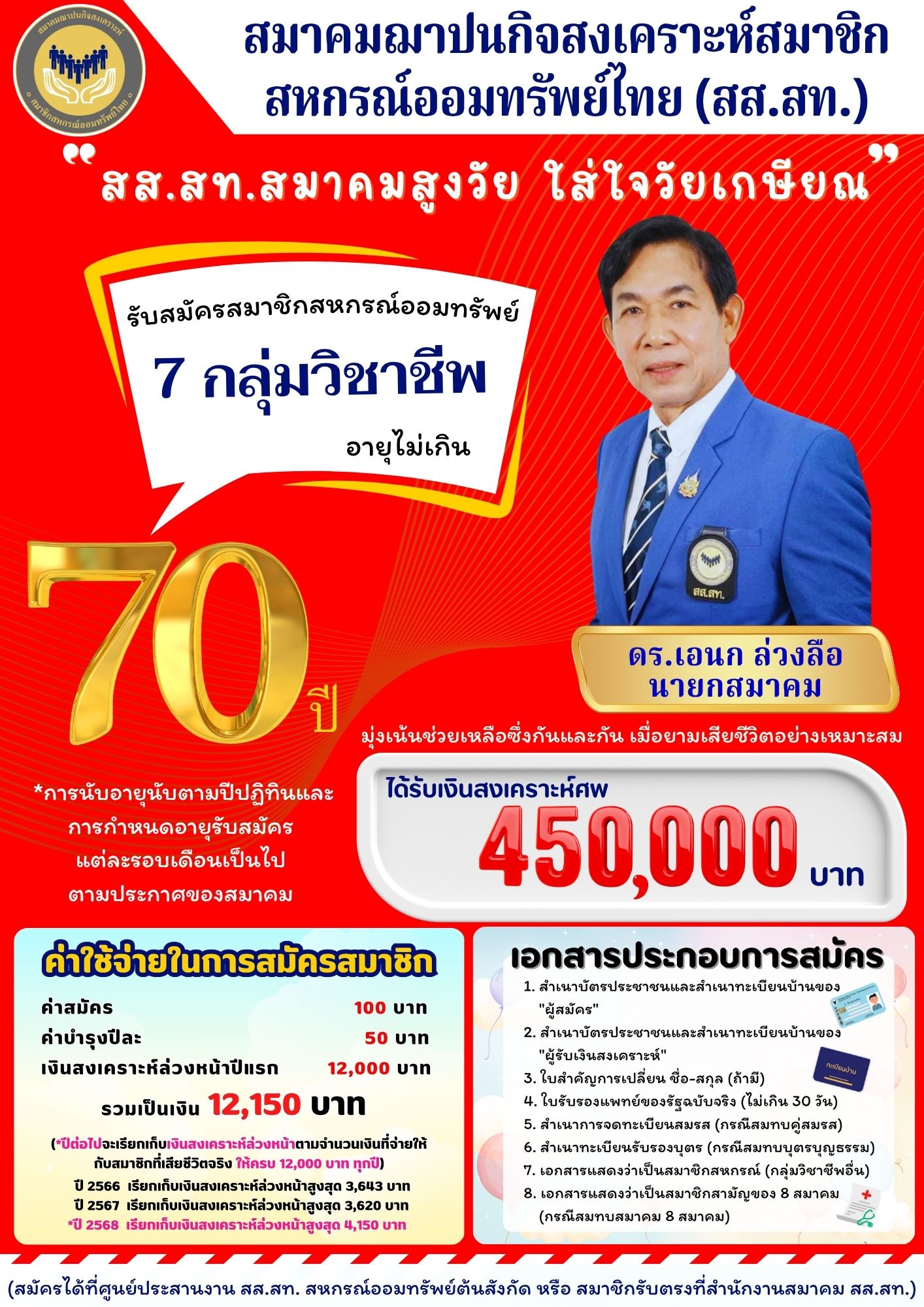 | ฌสอ.สธ.รอ. | สมาชิกสหกรณ์ บุตร, คู่สมรส, บิดา, มารดา | 2,650.00 | สมาชิก ไม่เกิน 60 ปี, อื่น ๆ ไม่เกิน 65 ปี | 100,000.00 | 3 เดือน | * เงินสงเคราะห์ศพคิดจาก(ค่าสงเคราะห์ศพล่วงหน้า 100 บาท x จำนวนสมาชิกคงเหลือ ณ วันที่เสียชีวิต) * ยื่นสมัครที่ โต๊ะประชาสัมพันธ์สหกรณ์ฯ |