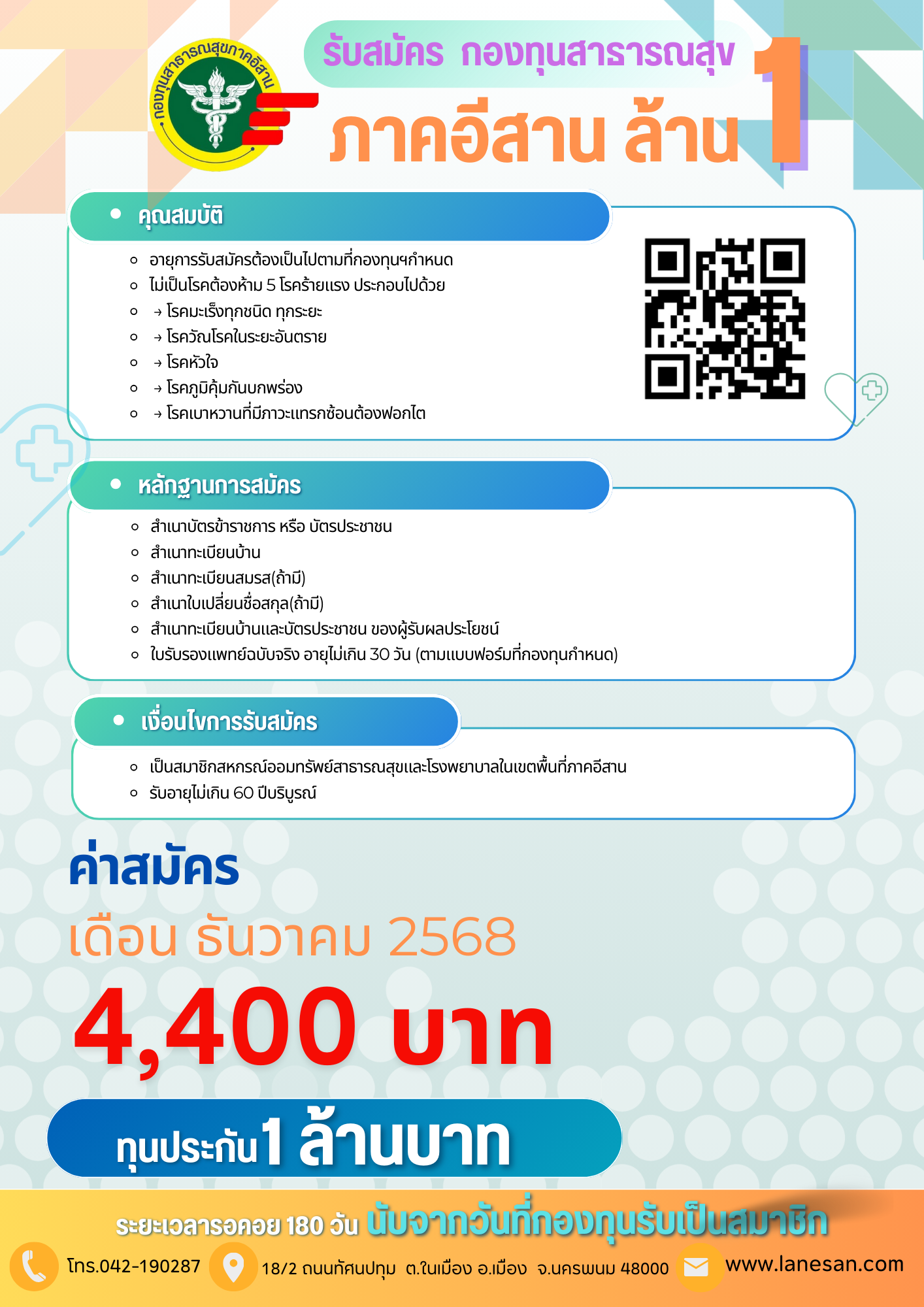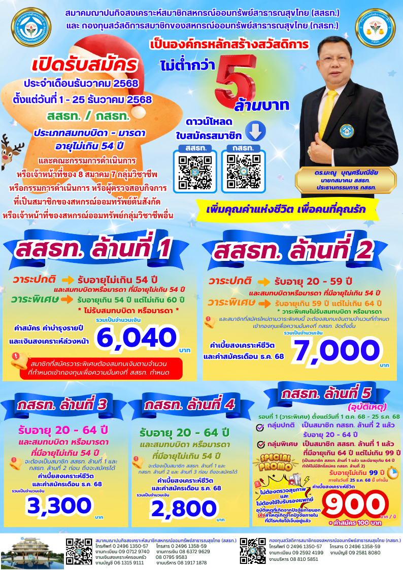 | กสธท. (ล้านที่ 4) | สมาชิกสหกรณ์ คู่สมรส บุตร,บิดา-มารดา(ไม่เกิน 54 ปี) | 2,800.00 | 20-64 ปี | 1,000,000.00 | 2 ปี | * ต้องเป็นสมาชิก สสธท. ล้านที่ 1, กสธท. ล้านที่ 2, และ กสธท. ล้านที่ 3 ก่อน * มะเร็ง ระยะรอคอย 3 ปี * ไม่รับอาชีพเกษตรกร และว่างงาน |